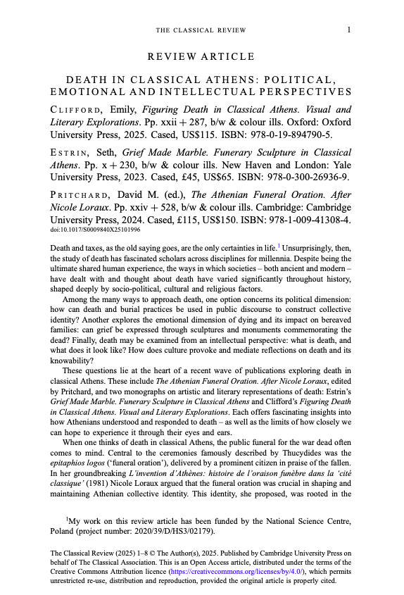 Ostatnią z tegorocznych publikacji naukowych jest artykuł "Death in Classical Athens: Political, Emotional and Intellectual Perspectives", omawiający najnowsze badania dotyczące problematyki śmierci w starożytnej Grecji. Artykuł ukazał się w prestiżowym czasopiśmie "The Classical Review" i jest dostępny w wersji Open Access (link).