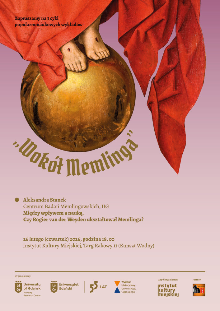 Centrum Badań Memlingowskich UG i Instytut Kultury Miejskiej serdecznie zapraszają na drugi w 2026 r. wykład w ramach popularno-naukowego cyklu zatytułowanego „Wokół Memlinga”. Wykład odbędzie się 26 lutego (czwartek) o godzinie 18.00 i zostanie wygłoszony przez Aleksandrę Stanek (Centrum Badań Memlingowskich UG)