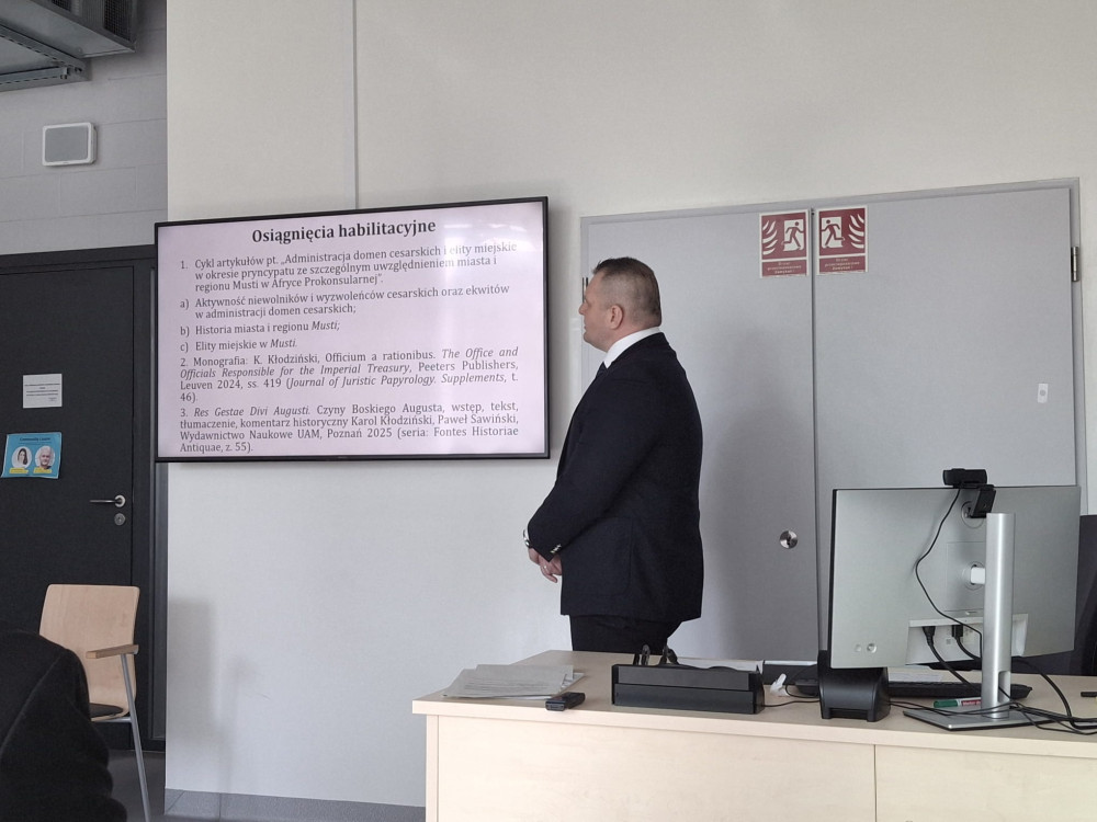 Mamy przyjemność poinformować, że nasz pracownik, dr Karol Kłodziński, adiunkt w Zakładzie Historii Starożytnej UG, uzyskał stopień doktora habilitowanego. Decyzję, w jednomyślnym głosowaniu, podjęła Rada Naukowa Dyscypliny Historia Uniwersytetu Warszawskiego w dniu 25 marca 2026 r.